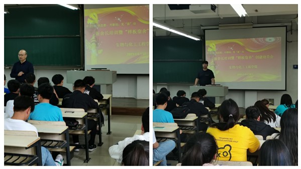 自5月10日开始,生物与化工工程学院一群由学生党员、党员发展对象、入党积极分子、学生干部、共青团员共计105名同学组成的宿舍“小当家”——新舍长队伍正式成立,他们自觉担负起管理宿舍的主体责任,积极发挥模范带头作用。为进一步提高新舍长的管理能力,5月18日,生化学院在崇文楼C201教室开展了新舍长培训暨“样板宿舍”创建动员大会。