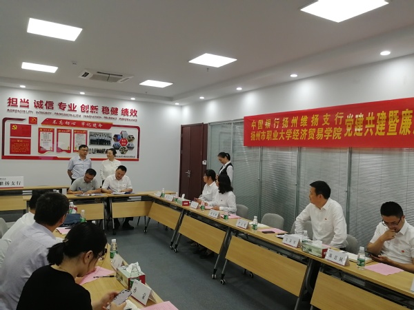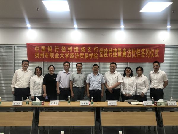 6月25日下午,永利官网经济贸易学院与中国银行扬州维扬支行党建共建暨廉洁伙伴签约仪式在扬州市维扬支行二楼会议室举行,学校纪委书记黄华明、经贸学院领导班子、中国银行扬州市分行副行长薛琴仙和扬州市维扬支行领导出席了签约仪式。签约仪式由中国银行扬州市分行维扬支行党总支副书记许文慧主持。