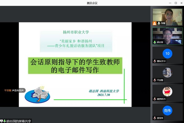 近日,外国语学院暑期“三下乡”社会实践活动团队——“美丽家乡 和谐扬州”青少年礼貌话语服务团队(2021年yL23411永利官网登录暑期“三下乡”社会实践活动重点团队)利用腾讯会议软件开展了一次别开生面的线上青少年礼貌话语宣讲活动。