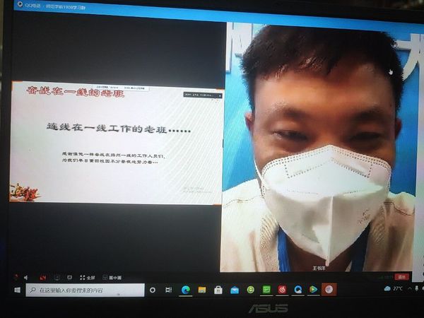 “大家好,好久不见,很想念大家。因为接下来还有任务,不能跟大家多交流。大家不用担心我,我会注意防护的。在这里,我也希望大家注意做好个人防护,遵守疫情防控规定。我们一起为扬州加油,早日在校园中相聚!”话音结束视频中断,王书洋又投入扬州市竹西社区的疫情防控志愿服务中去,这是学前1908班的疫情防控主题班会上,班主任王书洋老师的简短发言。