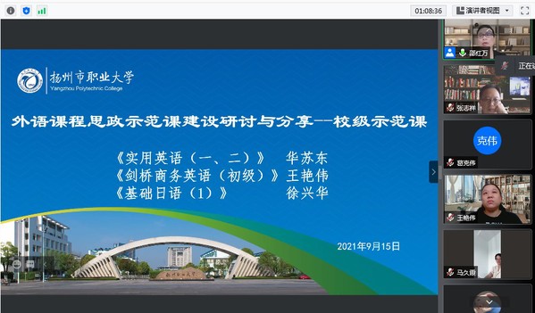 为进一步推进外语教学改革,把课程思政引向深入,服务国家战略需要,9月15日,外语学院举行“外语课程思政示范课建设研讨与分享—校级示范课”在线主题交流会。华苏东、王艳伟、徐兴华三位老师获批校级思政示范课程的老师与学院教师作了专题交流分享。