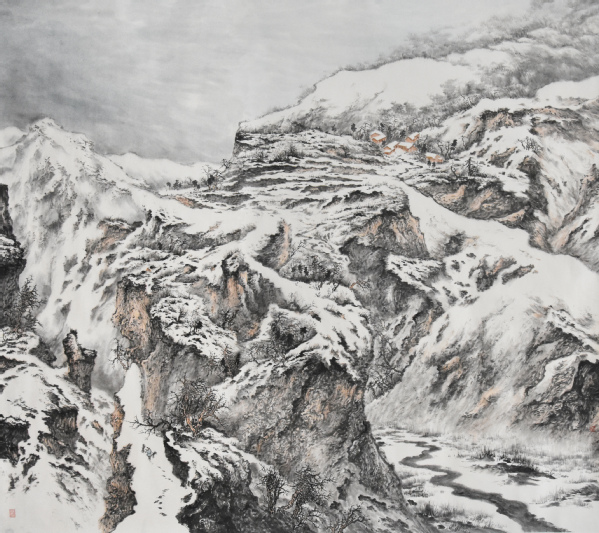 作品《雪霁樵歌声更远》(180×200cm)通过雪山、樵夫等画面内容,表现了樵夫在恶劣的环境下,不畏艰险、迎难而上的乐观精神。该作品曾入选2021年中国美术家协会主办的“悲鸿精神——第四届全国中国画作品展”。