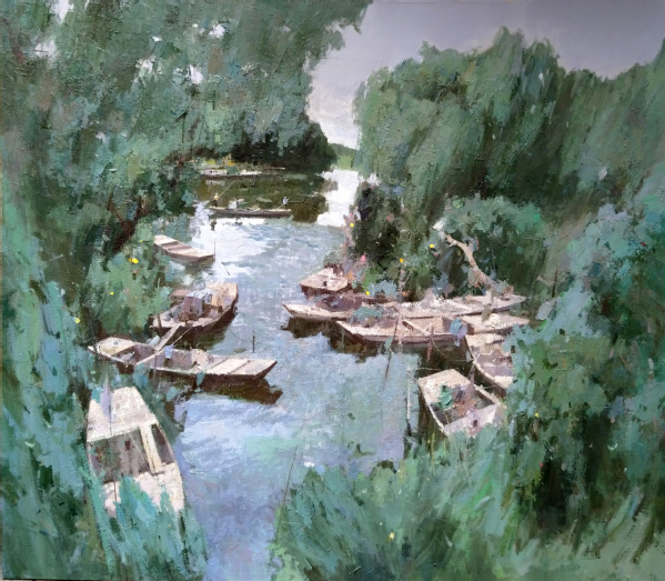 作品《水乡晨泊》(140×160cm)通过船、树、水等元素组合,描绘了苏北里下河的水乡风光。该作品曾入选中国美术家协会主办的“第九届全国(大芬)中青年油画展”。