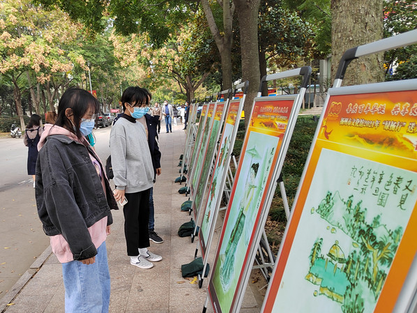 11月4日上午,“喜庆百年华诞 共享文化惠民”2021年“绿杨行”国画作品展在永利官网芳华大道展出。以花鸟、山水、人物、民俗等元素为题材的30幅国画作品亮相校园,送来了一股水墨浓郁的中国风。