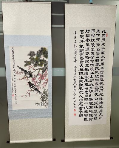 作品涉及题材丰富、形式多样、风格鲜明,其中包含行、楷、篆、隶、草等书法作品以及水墨写意、工笔山水、人物花鸟等国画作品。国际交流学院师生被作品中的拳拳爱国之情、满满的正能量深深打动,受到了一次震撼心灵的爱国主义教育。