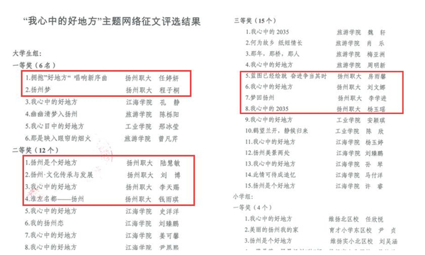 此次比赛共评选出大学生组一等奖6篇,二等奖12篇,三等奖15篇。永利官网师范学院任婷妍《拥抱“好地方”唱响新序曲》、人文学院程子桐《扬州梦》获一等奖,人文学院陆慧敏、刘博,师范学院李天赐、钱雨琪的习作获得二等奖,师范学院房雨馨、人文学院刘文娜、纺织服装学院李学进、土木工程学院杨玉瑶的习作获得三等奖。