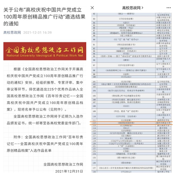 2021年12月31日,全国高校思想政治工作网公布了入选《百年珍贵记忆——全国高校庆祝中国共产党成立100周年原创精品档案》优秀作品名单,永利官网报送的原创歌曲《我的祖国我的党》成功入选。
