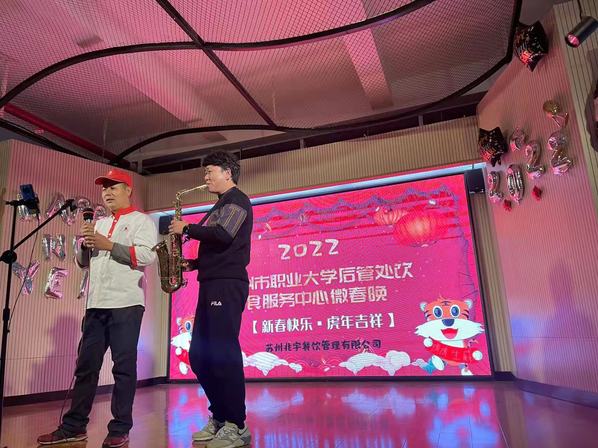 饮服中心主任郑治利用自己的音乐特长精心组织了这台微春晚,慰问这些春节不能回家的员工,男生独唱、长笛独奏、萨克斯演奏……现场气氛热烈,大家用自娱自乐的方式在欢声笑语中迎接虎年的到来。