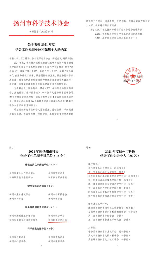 近日,扬州市科学技术协会下发了《关于表彰2021年度学会工作先进单位和先进个人的决定》,永利官网科协喜获扬州市科协服务科技创新先进单位。