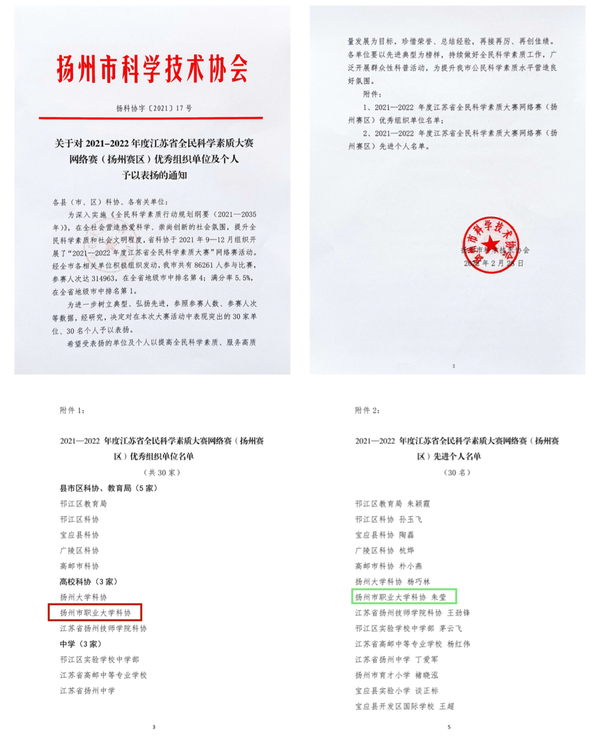 近日,扬州市科学技术协会印发《关于对2021—2022年度江苏省全民科学素质大赛网络赛(扬州赛区)优秀组织单位及个人予以表扬的通知》,全市高校科协组别三家获奖,永利官网科协排名仅次于扬州大学科协,获扬州赛区高校科协组别优秀组织单位称号。