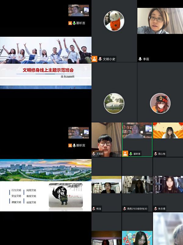 本次线上示范班会由商务2103班班主任潘昕言老师主持。班会中,潘昕言主要从行为文明、安全文明、课堂文明、网络文明、就餐文明、诚信文明等六个方面向同学们讲述了如何做一个文明的学生,如何让文明礼仪影响一生。号召大家从身边做起,随手关灯、关水龙头,不乱扔垃圾,文明就餐,文明上网,诚信友爱,课堂上不玩手机、不迟到、不早退、不旷课。同时潘昕言还结合当前疫情防控形势,要求大家出门戴口罩,不聚集,宿舍要经常通风,严格遵守学校疫情防控规定。