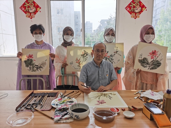 在邻桌,国际交流学院党总支书记陈峰正耐心地教同学们如何画中国传统水墨画,从蘸墨、用墨到运笔,同学们听得仔细入神,来自印尼的AFRIZA INSANI HAFISH(阿辉)同学羡慕地说:“看老师画的时候觉得很轻松,几笔就能画出很漂亮的画,自己画的时候才发现毛笔很难控制。”来自柬埔寨的蔡颂恩汉语非常流利,她跟着老师,一笔一划写下了“端午节快乐”几个字,觉得特别有成就感。