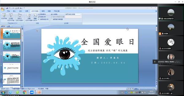 5月底,经贸学院举办了首届爱眼日手抄报大赛,一幅幅精心绘制的画作,传达出了学生们爱眼护眼的决心。****,经贸学院邀请了财管2001班朱冠宇家长李春生开展以“ 关注普遍眼健康,共筑‘睛’彩大健康”为主题的线上专题讲座,李春生作为一名专业医生,为学生详细介绍了眼睛的构造及工作原理,讲解了近视形成的原因、如何预防及保护眼睛的好方法,分析了同学们在日常生活、学习中的一些不良用眼习惯,让同学们深刻地了解到不良用眼带来的危害。