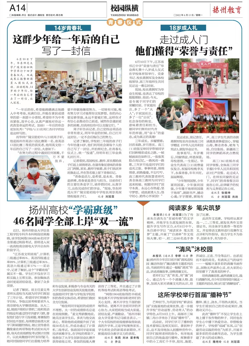 【扬州晚报】扬州高校“学霸班级” 46名同学全部上岸“双一流”