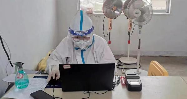 在滨海县蔡桥镇官尖村核酸检测点,周浩楠同学负责信息采集工作。因为村里老人多,大多数人携带身份证,周浩楠不厌其烦地指导老人们将身份证正确放在信息采集器上。当结束任务脱下防护服的时候,汗水已经湿透衣服。周浩楠说:“这个暑假能够以这种方式参加社会实践,我觉得很特别,也很有意义。”