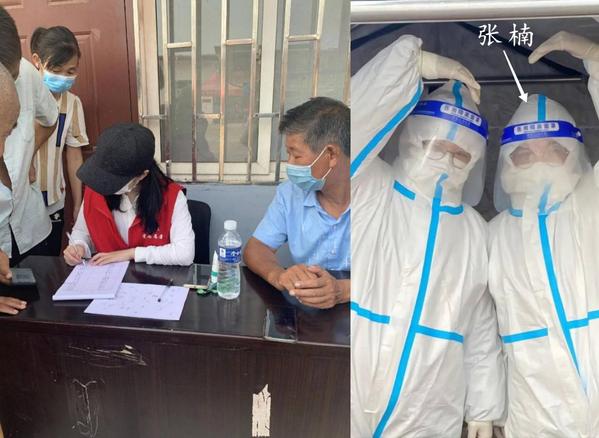 张楠同学暑假在家乡连云港赣榆区墩尚镇岳韩村社区担任志愿者。社区安排每五天一次全员核酸检测工作。前四天张楠负责检查进出村人员行程卡、测量体温、提醒村民佩戴口罩、登记来往车辆以及电话核实归乡人员情况等工作。第五天是核酸检测日,张楠戴好口罩,穿好防护服之后开始扫描身份证。“虽然天气很热,工作很忙碌,但以抗疫志愿者的身份进行劳动体验,很有成就感和幸福感。”张楠说。