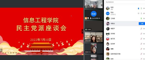 为更好发扬中国共产党凝聚人心、汇聚力量的政治优势,发挥民主党派成员在学校和学院发展过程中应有的作用,信息工程学院党总支利用暑期召开了学院民主党派人士线上座谈会,学院党政领导以及全体民主党派成员参加了会议。