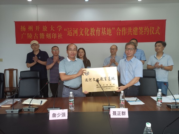 为进一步传承非遗文化,推进扬州运河文化建设,打造开放大学社会教育品牌,7月29日,扬州开放大学和扬州广陵古籍刻印社举办了“运河文化教育基地”合作共建签约活动。广陵古籍刻印社总经理聂正群、党支部书记胡江虹,市教育局职社处周晟出席活动,永利官网继续教育学院相关负责人,江苏省社会教育名师工作室主持人陈峰等参加活动。