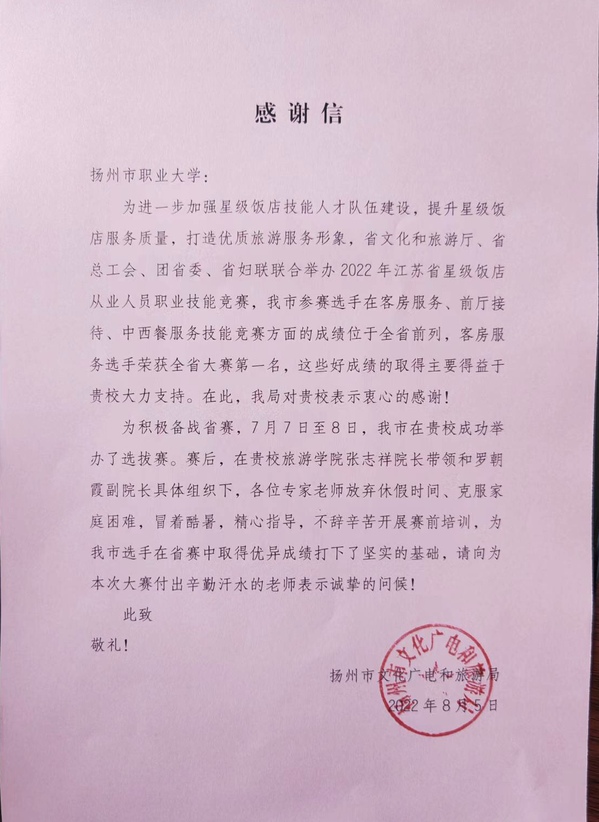 在刚结束的江苏省星级饭店从业人员职业技能竞赛中,扬州市代表队获得客房服务项目一等奖、前厅服务项目二等奖、中西餐服务项目三等奖,并获团体二等奖,成绩位于全省前列。