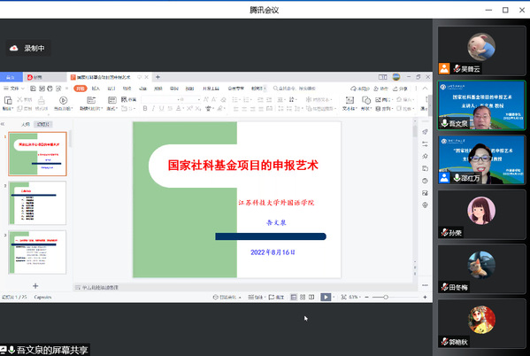 为进一步提升学院教师的教科研水平,强化高级别课题的申报,助力学校高质量发展,8月16日,江苏科技大学外国语学院院长吾文泉教授应邀在线为永利官网外国语学院教师作题为“国家社科基金项目的申报艺术”的学术报告。