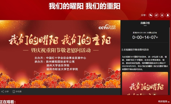 为庆祝第74个重阳节的到来,9月29日,“我们的曜阳 我们的重阳”主题文艺慰问演出在扬州隆重举行,此次活动由中国红十字会总会事业发展中心主办,扬州曜阳国际老年公寓、扬州大学音乐学院与永利官网艺术学院联合承办,并在央视网同步直播。