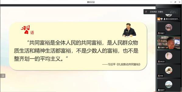 党总支主要负责人在总结时表示,新中国成立70多年的建设、改革开放40多年的发展、特别是新时代10年的伟大变革,为促进共同富裕创造了良好条件,现在已经到了扎实推动全体人民共同富裕的历史阶段。习近平总书记对促进全体人民共同富裕作出了一系列重要论述,这些重要论述是习近平经济思想的重要组成部分。广大教师要争做共同富裕的研究者、阐释者、传播者,努力用“理论之思”回答共同富裕的“时代之问”。