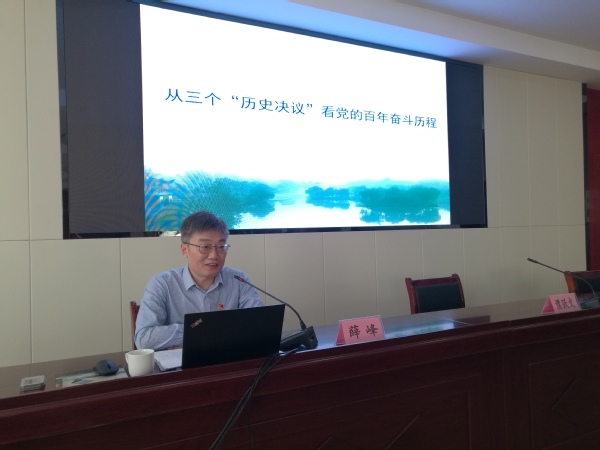 薛峰教授结合《关于若干历史问题的决议》《中国共产党中央委员会关于建国以来党的若干历史问题的决议》《中共中央关于党的百年奋斗重大成就和历史经验的决议》产生的历史背景和重要内容,通过列举大量历史史实,重点讲述了我们党百年发展历程中,始终践行初心使命,不断推进马克思主义中国化时代化,把马克思主义同中国具体实际相结合,同中国优秀文化相结合,实现了党的理论从毛泽东思想到中国特色社会主义理论体系,再到习近平新时代中国特色社会主义思想的三次伟大飞跃。与会人员一致认为通过本次学习,对中国共产党的百年历史有了更加充分的了解,特别是对“马克思主义中国化的三次飞跃”有了更加清晰的认识。