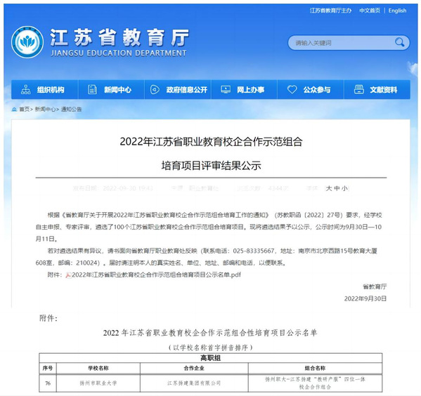 近日,江苏省教育厅发布了《2022年江苏省职业教育校企合作示范组合培育项目评审结果公示》,永利官网与江苏扬建集团有限公司组建的扬州职大-江苏扬建“教研产服”四位一体校企合作示范组合培育项目获批。