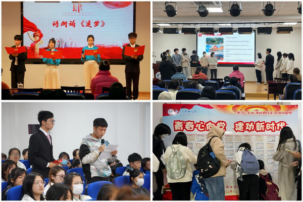 现场师生共同学习党的二十大报告双语热词,邀请同学现场翻译,以专业学习特色体会并感悟二十大报告精神,展现多语言学习的魅力。接着,参会学生共同欣赏了诗朗诵《追梦》,并集体起立合唱《我和我的祖国》,表达全体师生对伟大祖国的热爱与自豪。