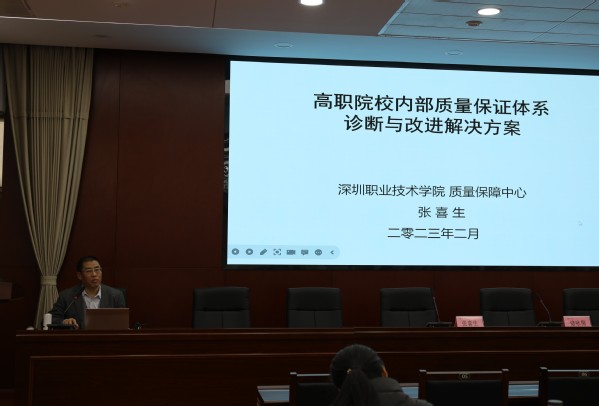 为高质量推动学校“双高”建设工作,构建学校内部质量保证体系,加快启动教学诊改相关工作,应教学督导室邀请,2月11日,深圳职业技术学院质量保障中心主任张喜生来永利官网指导内部质量保证体系建设工作。当天下午,张喜生教授做了《高职院校内部质量保证体系诊断与改进解决方案》的报告。各学院教学工作主要负责人,教师工作部、教务处、设备处等有关职能部门同志参加了会议。