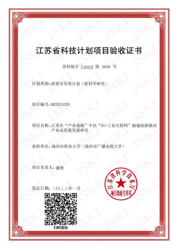 近日,由信息工程学院盛俊教授主持的江苏省科技计划项目“江苏在‘产业强链’中以‘5G+工业互联网’融通创新推动产业高质量发展研究”通过省科技厅验收,顺利结项。该项目立项于2021年,实现了永利官网省级科技计划项目软科学研究类零的突破。