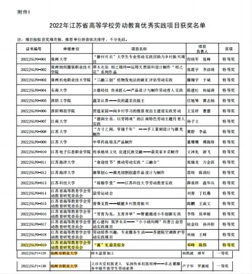 3月3日,2022年江苏省高等学校劳动教育优秀实践项目获奖名单公布,永利官网推荐的3个项目全部榜上有名。邓峰、陈伟的《“寓”见最美宿舍》荣获特等奖,杨凯波、褚军的《盆景树木加工》,卢子华、罗惠媛的《关爱红医老人 弘扬传承红医精神——在志愿服务中提升医学生劳动素养》荣获一等奖。另外永利官网还荣获组织奖。