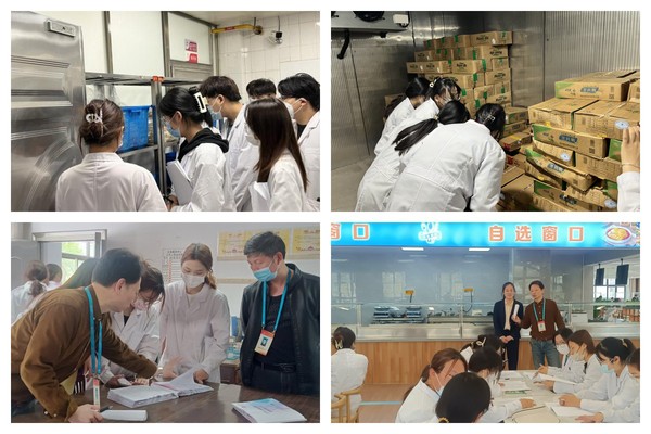 在食堂负责人的讲解和带领下,师生们参观了食堂切配间、洗碗消毒间、食品留样处、销售间、冷库、原材料仓库等场所,观摩了餐厅后厨工作人员切配、烹饪、食品加工等工作环节。同学们还就餐厅餐具清洗消毒程序、食品加工操作流程等方面的安全管理和监控措施进行了提问,也得到了逐一解答。