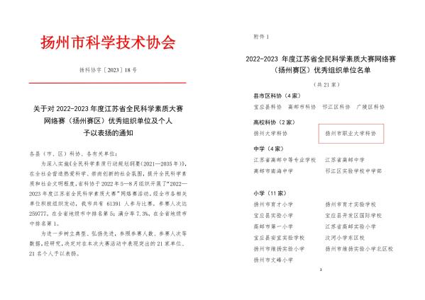 近日,扬州市科学技术协会印发《关于对2022—2023年度江苏省全民科学素质大赛网络赛(扬州赛区)优秀组织单位及个人予以表扬的通知》,永利官网科协获扬州赛区高校科协组别优秀组织单位称号。