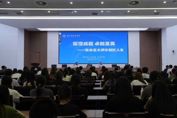 在《髹漆成器 卓越至美》讲座中,张来喜大师用朴实的语言和真挚的情感,讲述了自己41年的剔红人生。他从扬州漆器历史讲起,结合红雕漆的工艺和漆器代表作,鼓励学生把工匠精神融入学习和生活,用匠心铸就青春梦想。“做产品不要跟风做,除了要有技术外,还要有思想、有创意”“光想着名利是干不成事的,我就做我的事”……他精益求精、追求卓越的精神深深感染着在座师生,现场不时响起阵阵掌声。讲座现场,学校聘请张来喜为学校客座教授。