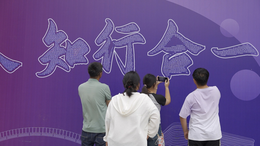 自己的名字出现在校园巨大展板上,是怎样的体验?在职大瘦西湖校区和高邮湖校区,两块巨大的展板格外醒目,展板上印着近5000名新生名字组成校训“立德树人知行合一”八个大字。