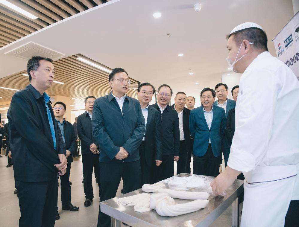 当日,中央组织部办公厅二级巡视员、第五批援青干部人才总领队、青海省委组织部副部长徐小兵带领中央及六省市援青干部考察团,慰问了正在高邮湖校区学习的青海省果洛州玛多县籍中职护师班学员后,考察了高邮湖校区“青海拉面”店,听取相关介绍,并详细了解“青海拉面”品牌推广、市场经营等情况。