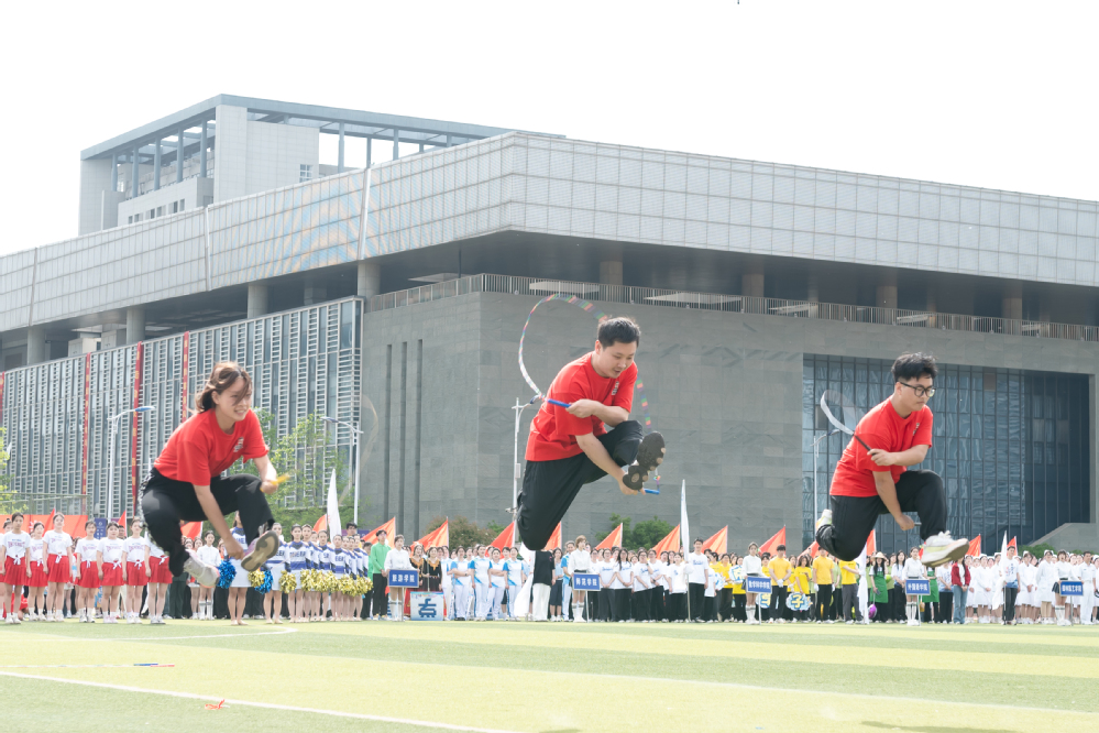 开幕式上,瑜伽方阵以柔美身姿演绎力与美的交融,啦啦操、健美操团队用活力的舞姿展现了青春韵律,街舞表演以酷炫的舞步赢得阵阵喝彩,特别是融合传统与现代元素的“哪吒花样跳绳”表演,将现场气氛推向高潮。