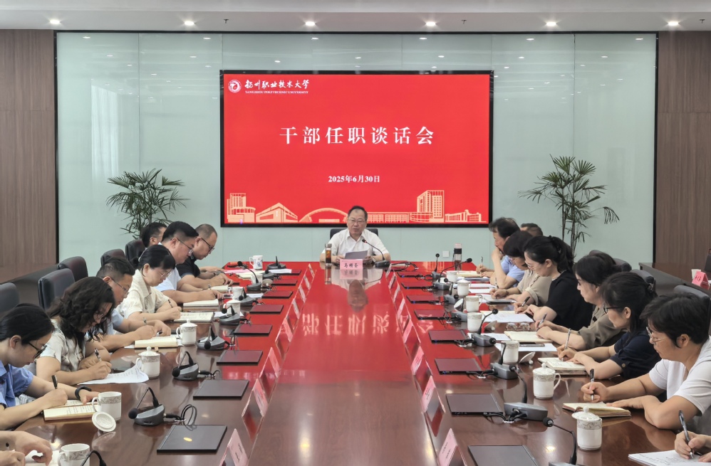 6月30日上午,学校在科技综合楼301会议室召开干部任职谈话会,党委书记马顺圣,党委副书记陈亚鸿,党委委员、纪委书记黄华明,党委委员、组织(统战)部部长华炜出席会议。新近提任的学校中层正职、中层副职干部以及学院(部门)内设机构负责人等22人参加了会议。