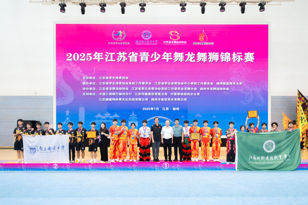 7月8日至11日,2025年江苏省青少年舞龙舞狮锦标赛在扬州职业技术大学举行。这场为期四天的传统文化体育盛会吸引了来自全省13个地市的40支代表队,近800名运动员、教练员齐聚扬城,在竞技与交流中共同谱写龙狮文化新篇章。扬州职业技术大学、南京邮电大学、南京工业大学获高校组前三名,扬州市树人高级中学、扬州市江都区小纪中心小学获甲组、丙组团体总分第一名。校党委书记马顺圣为获得高校组传统南狮第一名、高校组团体总分前八名的获奖运动队颁奖。